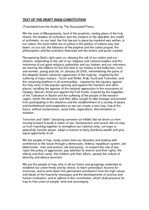 "We, the people of Iraq, have taken upon ourselves to write this constitution in freedom and unity, to learn from what has preceded it and let it be a guide to us in the future, and to draft it using the values and examples of the prophets of old and new developments in knowledge and civilization. Abiding by this constitution will preserve for Iraq the free unity of its components in terms of people, land and sovereignty."