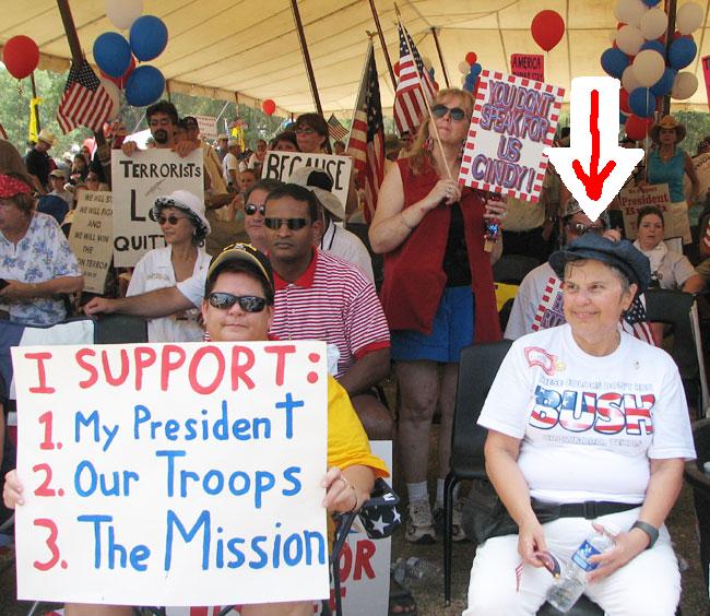 The theme of most of their speeches was that Cindy Sheehan was prolonging the war by giving hope to the terrorists. “Iraqis love us… and we are winning.” “The media is currently on a anti-American rampage… Insurgents love the U.S. media.” Darrell Ankarls of 570 KLIF AM radio boomed from the stage that “Cindy’s stuff is making into the sandbox” and it is “getting our boys killed.” Cindy should “shut up” and “go home!”