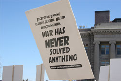 Free Republic and the their right-wing youth group of “ironic” Protest Warriors were repeatedly thanked for their support and participation in the rally. The Protest Warriors are young people who usually appear at anti-war related activities with slogans based on “right-wing irony,” such as “War Has Never Solved Anything (except for everything).” However, in a odd turn of events, and despite repeated pleadings that “we are on your side, we are on the right,” the rally turned on these kids. Shouting “Cindy Go Home!” a small mob gathered around the three or four Protest Warriors, attacked their oversized signs, and began stomping on the signs.
