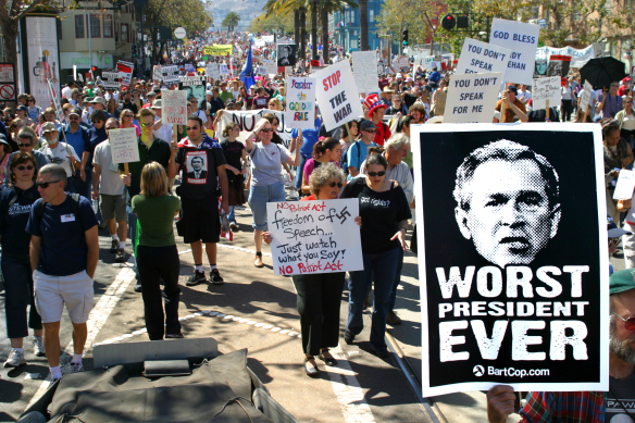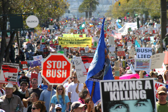 On a day of national protest, 50,000 people march in San Francisco against the war.