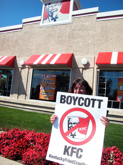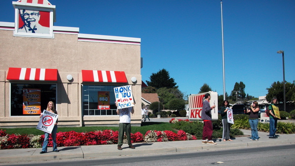 There were about a dozen people at the demonstration on Mission St. in Santa Cruz on October 2, World Farm Animals Day, to protest KFC. Mission St. is also Highway 1 and there were a lot of people that honked in support of the demonstration. Informational flyers were passed out to passing motorists, as well as customers who were both entering and leaving KFC. This particular demonstration lasted about an hour, and by the time we left, there were only two customers in the restaurant.