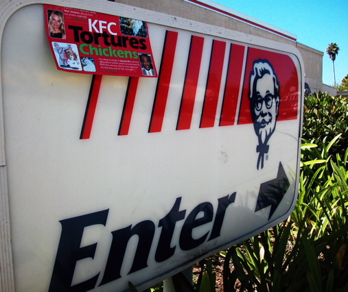 Internationally, People for the Ethical Treatment of Animals (PETA) has a campain website called KentuckyFriedCruelty.com asking KFC to eliminate the worst abuses that chickens suffer on the factory farms and in the slaughterhouses of its suppliers, including live scalding, life-long crippling, and painful debeaking.