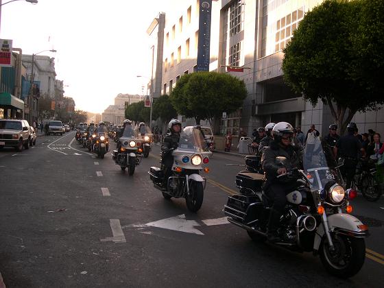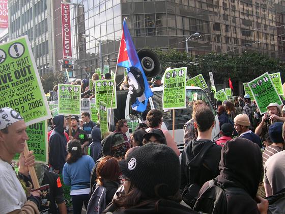 There was some direct action that took place today, mostly in the form of blocking traffic. People organized a small group who was willing to do this after the main march had left. The police moved in to arrest people, many fled to the sidewalks and others involved were arrested. This was a group of NOT ONLY anarchists, but people with other or no-political affiliations. Here are some pictures, which will tell the story in a much greater fashion.