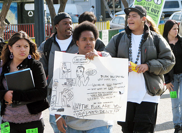 Over 2,000 people rallied and marched in San Francisco yesterday in a protest organized by the new "The World Can't Wait! Drive Out the Bush Regime!" group. Hundreds of youth walked out of high schools across the Bay Area and made their way to the SF City Hall in groups of three to forty. The event was part of a national day of action billed as the "beginning of the end of the Bush Regime."
