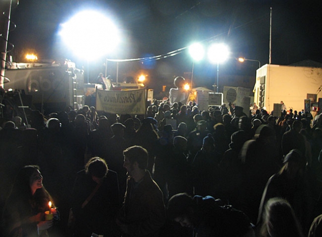 San Quentin Prison (January 17, 2006) – About 400 people gathered at the gates of San Quentin Prison last night to protest the execution of 76-year-old inmate Clarence Ray Allen shortly past midnight this morning. Was the lower turnout of protesters “hypocritical” compared with the larger protests staged on behalf of Stanly Tookie Williams? Mike Farrell argued that the hundreds present represented the truth that people opposed the death penalty, even without the books, movies, and demonstrated redemption. Todd Chretien argued that movements simply are not built in a liner fashion, with each protest larger than the other, until our side wins… but in the end, we will win if we persevere. Many present identified with faith-based organizations. “Not in our name” was a common refrain of those who stepped up onto the soapbox to speak as the State of California murdered Clarence Ray Allen this morning.