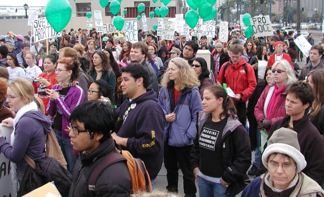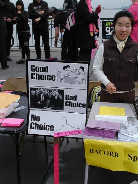 Several hundred pro-choice protesters rallied near pier 7 Saturday before the start of the anti-abortion march down Embarcadero.