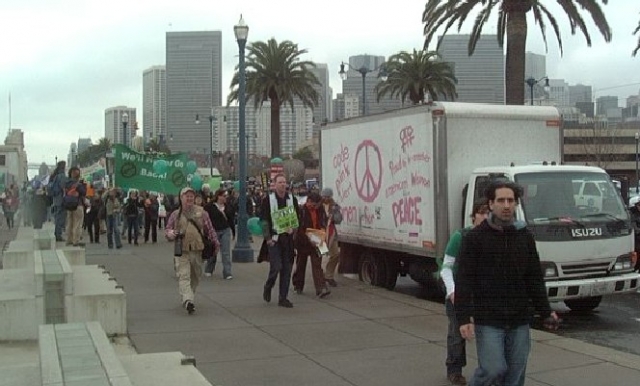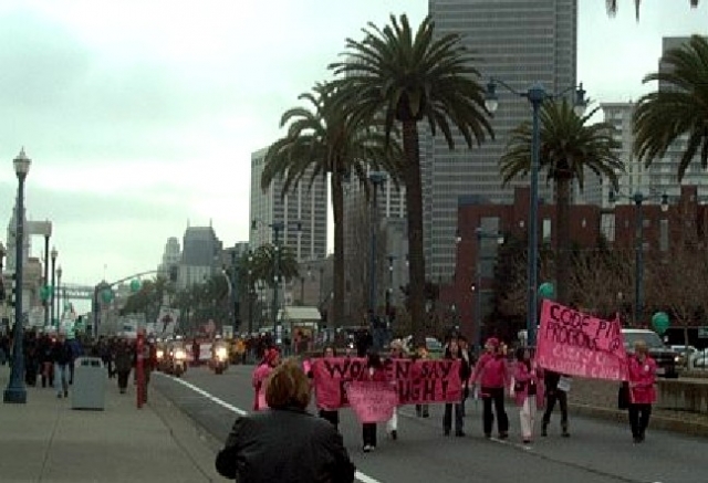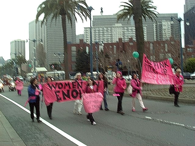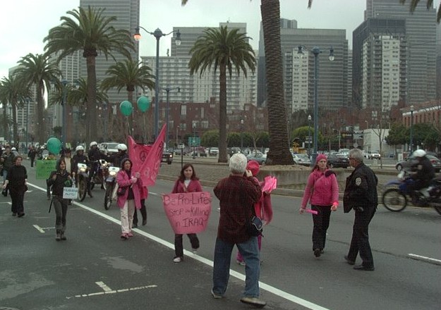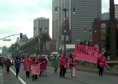 Code Pink made a brilliant tactical move by taking the street in front of the Anti's march , causing the cops to hold back the marchers for some time. They were able to walk a signifigant distance unopposed while the cops tried to get their act together, but finally wildly careening motorcycle cops descended on them and got them out of the street.
