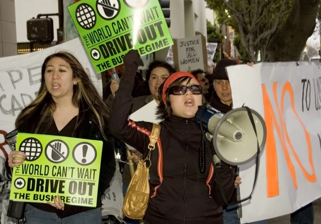The campaign and European march also has opposed plans for a U.S. invasion of Iran, explaining in one of its leaflets: "The American government… has declared that it seeks to liberate the women of the Middle East from the yoke of Islamic fundamentalism. This is a ridiculous claim that makes a mockery of real liberation and is an insult to the women of the Middle East. The march of events in Afghanistan and Iraq should have helped those who were taken in by these self-styled liberators of Middle Eastern women to realize how badly they were fooled. If anyone still believes that George Bush and his ilk are liberators of women, please talk to American women fighting to prevent him from taking away their right to abortion as well as against the efforts of the Christian fascists to dominate every aspect of the lives of women in the U.S. What George Bush is taking away from the women in the USA he will not deliver to women in Iran, Iraq, Afghanistan or any other country."