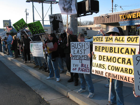 (Sacramento, CA March 18, 2006) The culmination of three consecutive Saturday anti-war/anti-Bush rallies was held in Sacramento on March 18. Over 400 Sacramento activists gathered at 16th & Broadway to mark the third anniversary of the U. S-led illegal aggression against the sovereign nation of Iraq.