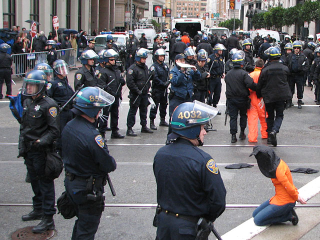 San Francisco (March 20, 2006) – On the third anniversary of the U.S. attack on Iraq, about two hundred people staged a “visual takeover” this morning of the hub of downtown at Montgomery and Market Streets. Organized under “Act Against Torture,” protesters carried enlarged photos of Abu Ghraib prison torture victims, hoisted banners such as “Shut Down Guantanamo”, and chanted “Stop the War. Stop the Torture.” About a dozen people, many in orange jumpsuits, were arrested after blocking Market Street when street theater turned into civil disobedience. "We cannot do what we are doing, and call ourselves a democracy," said Kate Raphael of Act Against Torture. "Democracies do not kidnap people and take them thousands of miles from home, to be beaten, tortured, and held incommunicado for the rest of their lives without even a trial. As citizens of a country that is guilty of these actions, it is our duty to stand up and stop this injustice."