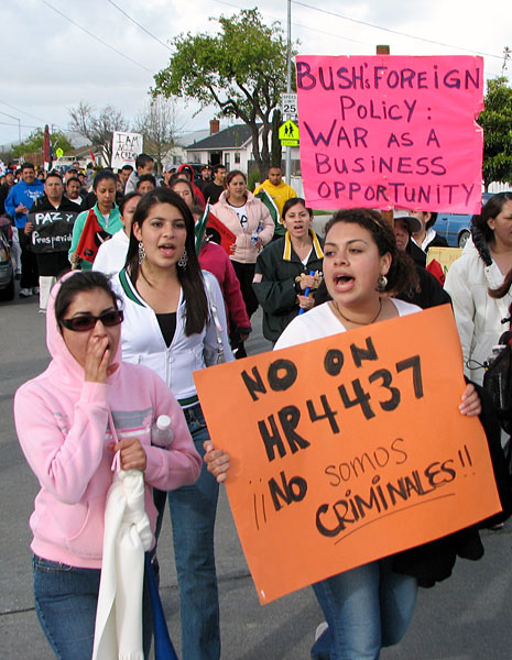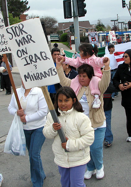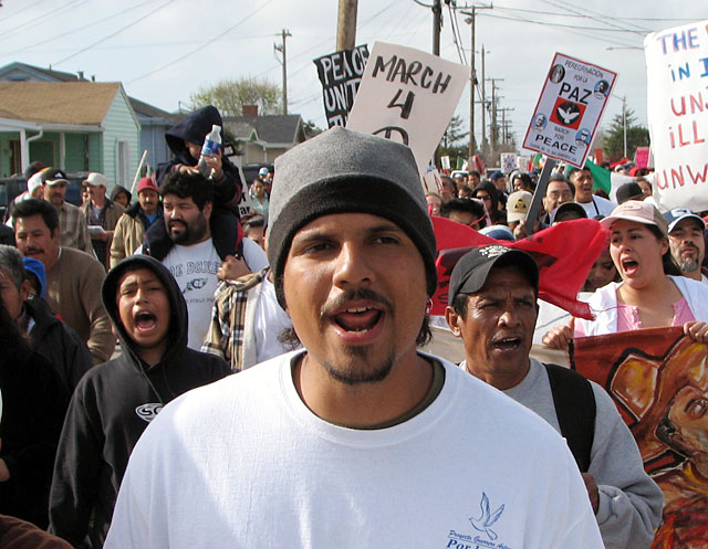 Salinas, California (March 25, 2006) – A thousand Latino immigrants joined Gold Star Families for Peace member Fernando Suarez del Solar, and Iraq War resister Pablo Paredes this afternoon for the 5 mile Salinas leg of their 241 mile trek. Like the thousands that marched earlier this morning in Watsonville, many were moved to take to the streets to also oppose the draconian anti-immigrant bill HR4437. The historic California Peace March is scheduled to finish in San Francisco on Monday.