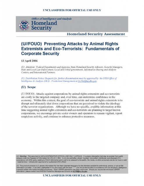 "Attacks against corporations by animal rights extremists and eco-terrorists are costly to the targeted company and, over time, can undermine confidence in the economy. ... Although we have no specific, credible information at this time suggesting animal rights extremists and eco-terrorists are planning to target known corporations, we encourage private sector owners and operators to remain vigilant, report suspicious activity, and continue to enhance protective measures."