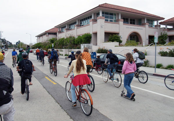 On Friday, April 29th, a large mass of bikers and a young girl with a scooter, took to the streets of Santa Cruz to celebrate Critical Mass, the bike ride which takes place the last Friday of each month all around the world.