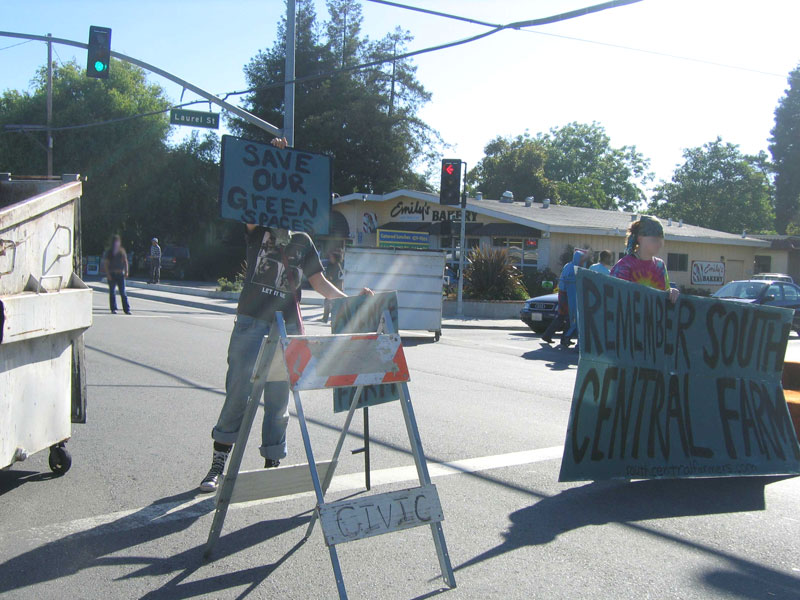 At 8:30 am Friday morning, demonstrators staged a blockade at a central Santa Cruz intersection (at Laurel St. & Mission St/Hwy 1) as a gesture of solidarity with the hundreds of families who lost their land in Tuesday's forced eviction of the South Central Farm in Los Angeles. Holding signs both large and small, the 30 or so demonstrators blocked traffic at the intersection with A-frames, a stray sofa, and at least four dumpsters rolled in from nearby businesses. Flyers explaining the legacy of the Farm were distributed to the delayed drivers with responses ranging from enthusiastic interest to violent threats. No one was injured, nor were any citations or arrests made during the action.