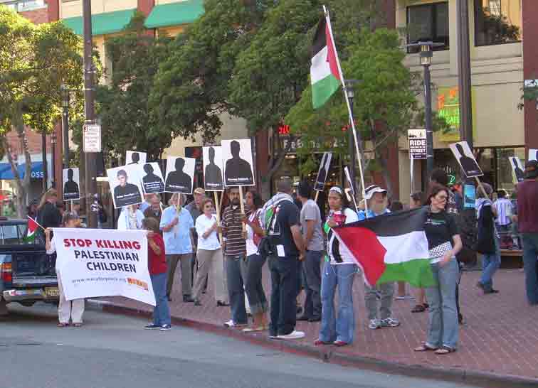 The crowd carried banners, Palestinian flags, and signs with the names and pictures of children who have been killed by the Israeli army, listened to MECA and ADC speakers, and marched for a mile chanting and disseminating information to onlookers.