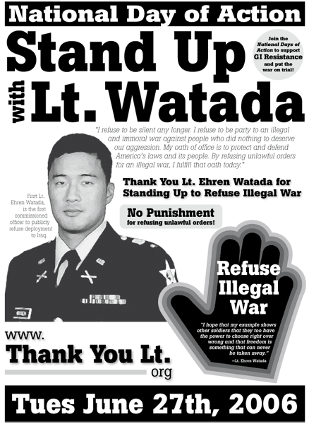 On June 22, U.S. Army First Lieutenant Ehren K. Watada became the first commissioned officer to publicly refuse deployment to the unlawful Iraq War and occupation. Lt. Watada fulfilled his pledge to resist he first made at June 7th press conferences in Tacoma and Honolulu. He is currently restricted to Fort Lewis pending changes and a probably court martial later this summer.