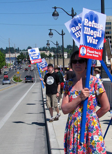 OLYMPIA, WA (June 26, 2006) - Organized by the Olympia Movement for Justice and Peace, a hundred supporters of Lt. Ehren Watada gathered near the Washington state capitol building yesterday. Holding signs that read “Refuse Illegal War – Thank You Lt. Ehren Watada”, Lt. Watada’s father Robert Watada and step-mother Rosa joined Olympians to span the centrally located Fourth Street Bridge.