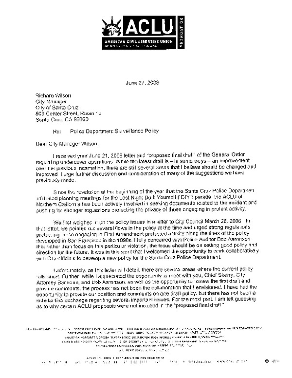 According to Mark Schlosberg of the ACLU, contrary to his expectations, the process of drafting the policy was not a collaborative one and involved one initial meeting and one opportunity for minor changes.