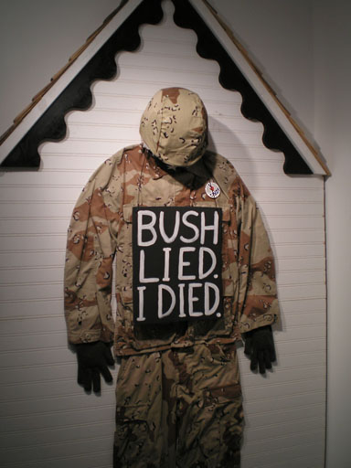 A small group of local activists gathered in front of Axis Gallery in downtown Sacramento on Saturday evening to demonstrate against the occupation of Iraq, the Bush administration and the ongoing Israeli violations of Palestinian human rights in the occupied territories. Participants displayed signs, played guitar, sang, distributed literature and chatted among themselves. The mood was very positive and friendly. It was a very warm evening and participants took breaks from the demonstration in order to check out the art in the air-conditioned gallery, which included Steve and Virginia Pearcy's famous, "BUSH LIED I DIED" soldier display. The response of motorists driving by and Gallery patrons was somewhat subdued, but overwhelmingly positive.