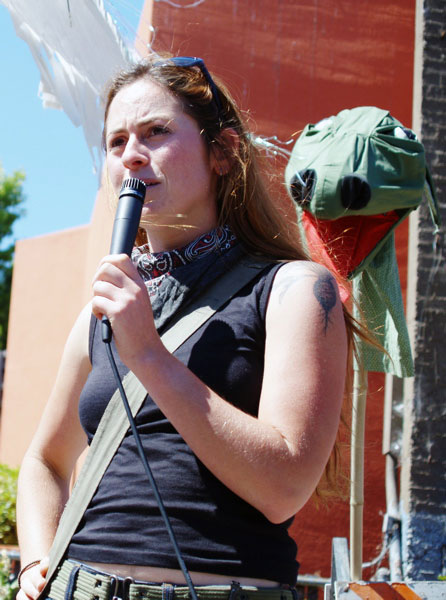 A majority of sidewalk onlookers were curious and willing to read the handouts, and a few joined in. The rally began at the clocktower and grew in numbers until spilling out on to Front St. at 3:00pm. Comfortably filling most of the asphalt, the assembly proceeded down Front to Laurel Street, turning to come back northward up the crowded Pacific Avenue drag and finally ending in a courtyard area across from the Post Office. Marchers congregated in the courtyard to listen to speakers, announcements, and a statement from the farmers, broadcasted from the mobile bike cart PA system.