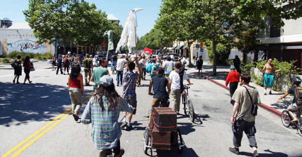 On July 9th, about 60 people paraded through downtown Santa Cruz as part of the international days of solidarity with the South Central Farm in Los Angeles. Marchers carried colorful anti-development signs and banners, handed out leaflets, taped posters up everywhere, and played improvised drums.