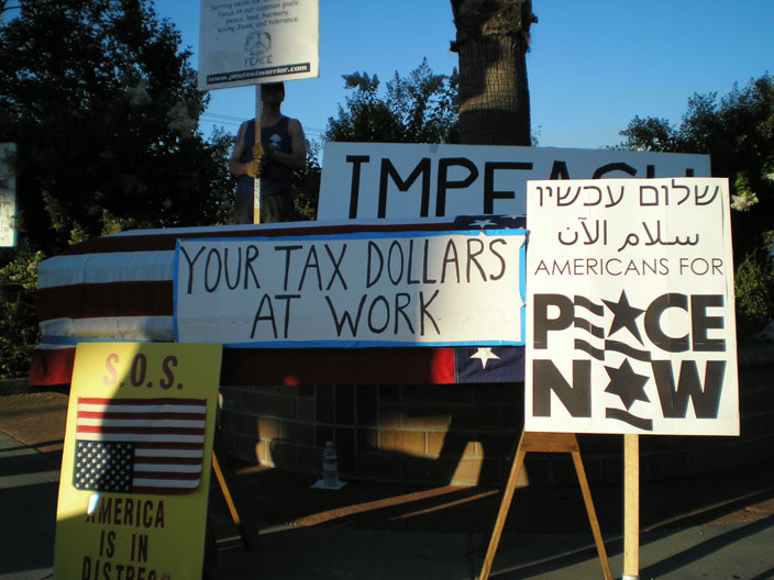 A fairly large number of local peace activists gathered at 16th & Broadway on Saturday evening, July 15 to protest Israel's military offensive against civilian targets in Lebanon and Gaza, as well as the ongoing US occupations of Iraq and Afghanistan and the Bush administration. The event was sponsored by Stephen & Virginia Pearcy, Sacramento Coalition to End the War, National Council of Arab Americans (NCA)-Sacramento, Not in Our Name/Sacramento, Sacramento World Can’t Wait, Sacramento for Democracy, Veterans for Peace/Sac Chapter, Code Pink/Davis Chapter, CSUS Faculty for Peace & Justice, Chicano Consortium, and many others.