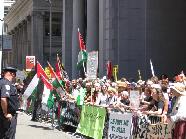 Over four hundred people rallied in front of the Israeli consulate in San Francisco in response to a call for Jewish voices to speak out against the Siege of Gaza and the bombing of Lebanon. The demonstration was called by Break the Silence, Jewish Voice for Peace, and Jews for a Free Palestine (see their call to action below) and in spite of taking place on a weekday, drew one of the biggest crowds in front of the consulate since the recent crisis and escalation by Israel.