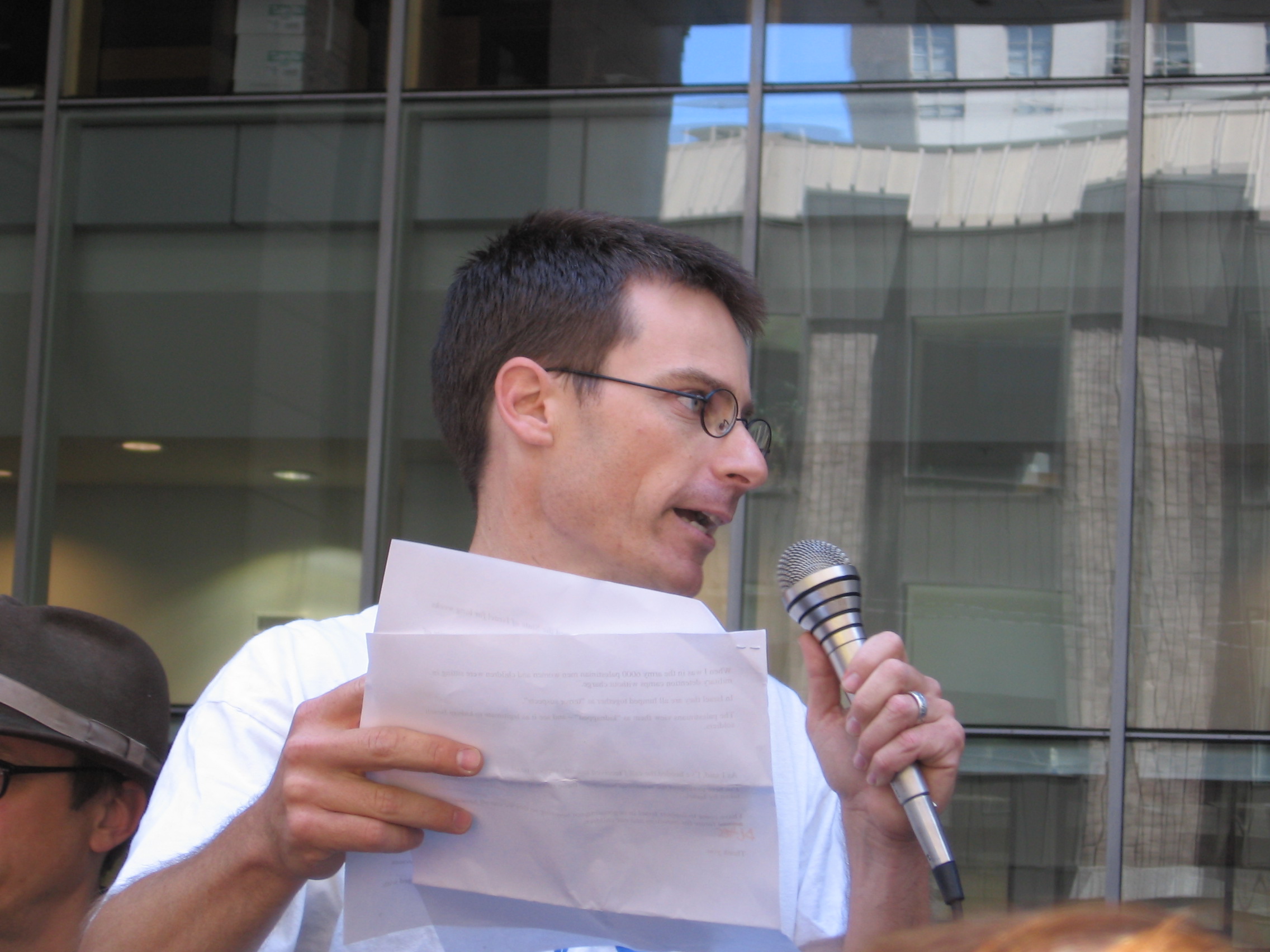 After a rousing and short program including speakers from Break the Silence and Amir Terkel, an Israeli Refusenik (Refuseniks are Israeli soldiers and reservists who refuse to serve in the Occupied Territories, in protest against Israel's actions in the West Bank and in Gaza), over a dozen Jewish activists took to the street and blocked Montgomery Street in solidarity with the people of Palestine and to call for an and to the siege of Gaza, to the bombing of Lebanon, and to the occupation of Palestine.