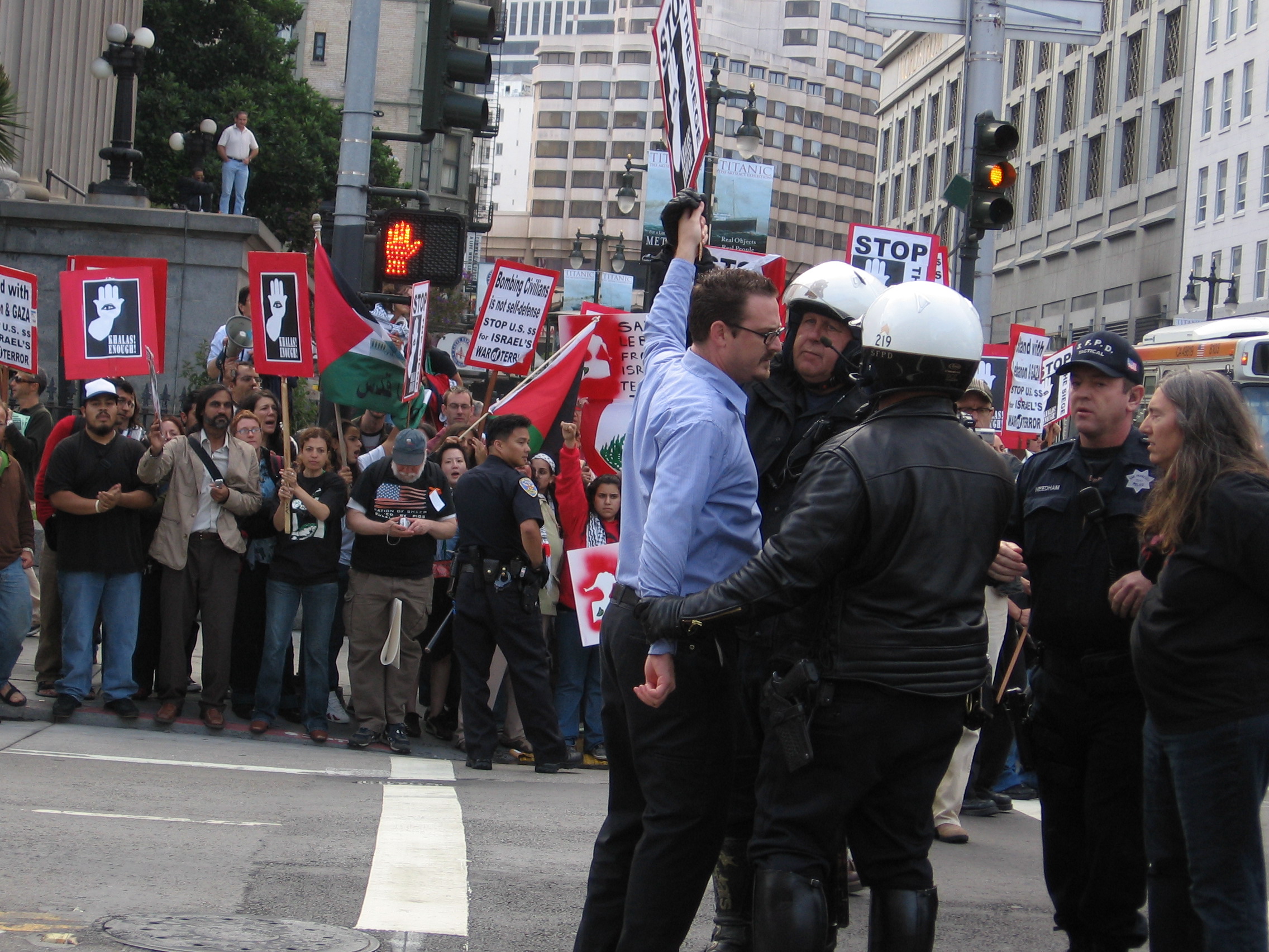 After a spirited rally denouncing Senator Feinstein for her support of israel's bombing of Gaza and Lebanon, hundreds marched to the SF Chronicle building, where 8 activists were arrested.