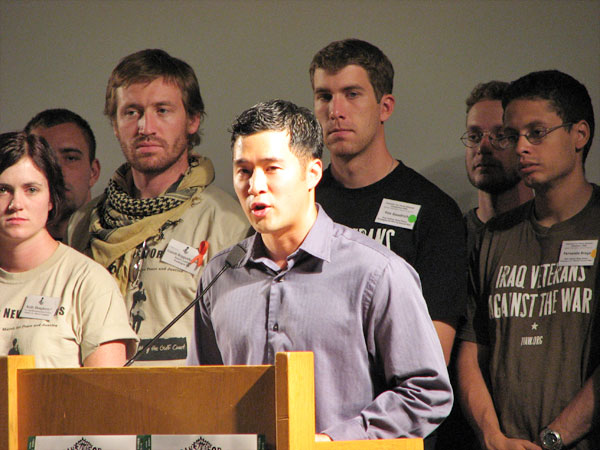As Lt. Watada took the stage to the chorus of “thank you,” three dozen members of the growing Iraq Veterans Against the War filed on stage to stand behind him. All of them members of the U.S. military since September 11, 2001 – most of them Iraq War veterans.
