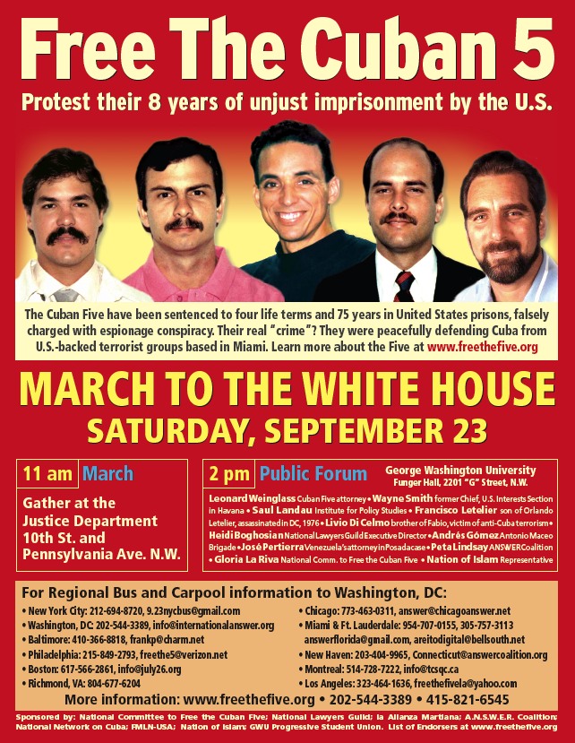 Chris Banks, coordinador de enlace de la Marcha, ha dicho: “Se han recibido mensajes de apoyo de Nueva York, Eugene, Tampa, Los Ángeles, San Francisco, El Paso, Nashville, Búfalo, Chicago, Virginia, Carolina del Norte y otros lugares. Como también hemos recibido solicitudes de información general, videos y hojas informativas sobre el caso de los 5, así como también de personas interesadas en formar nuevos comités de apoyo a los 5. Más allá de la participación en estas actividades en Washington este gran esfuerzo nos permitirá expandir el apoyo a favor de estos valientes luchadores antiterroristas”.