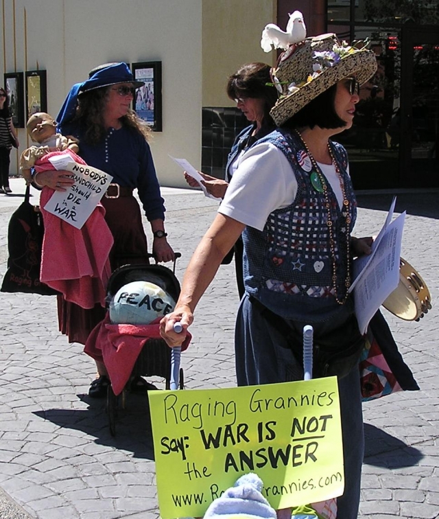 Raging Grannies in the heart of Silicon Valley were evicted from streets in San Jose for singing anti-war songs on Grandparents Day, Sept 10. Our appearance was part of a National Grandparents for Peace Action endorsed by Yoko Ono and centered in NYC. The local Grannies are in an ongoing battle with the owners of the tony shopping area "Santana Row" built on streets that are used as public spaces. The press including FOX affiliate KTVU (San Francisco), Metro Silicon Valley, and the Chinese World Journal have been following our story...