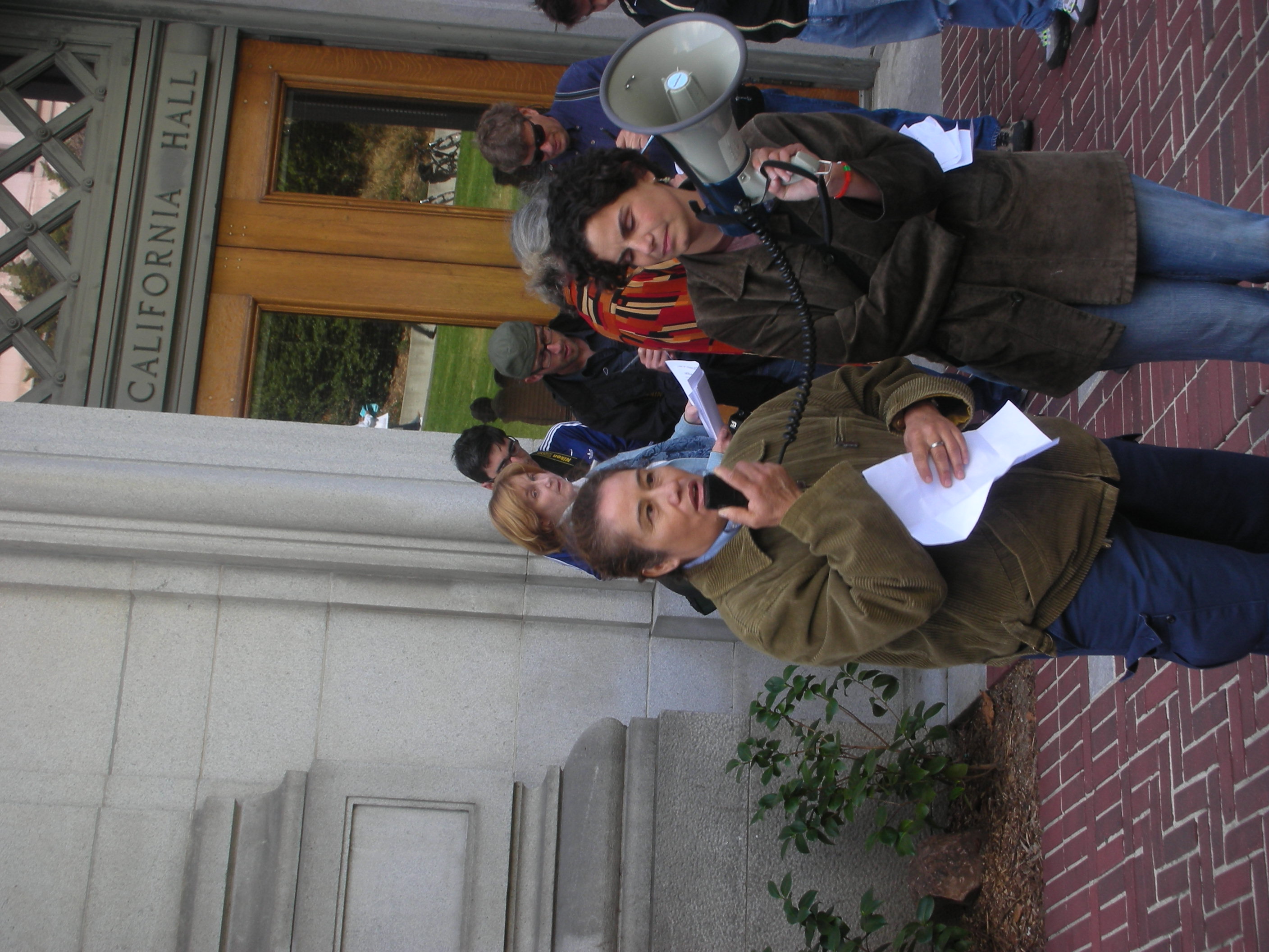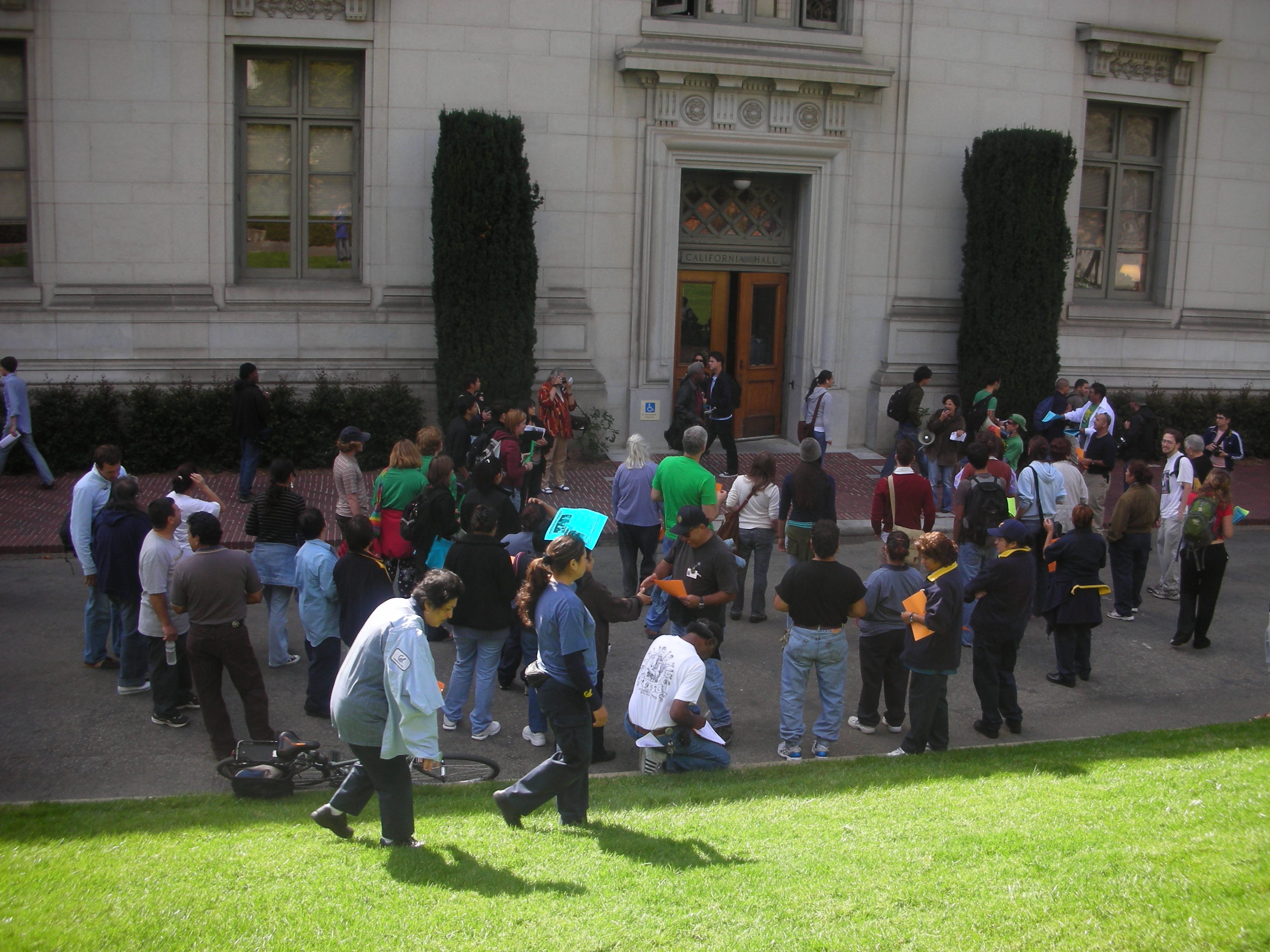 Here is an excerpt from one of the announcement fliers that supporting organizations were distributing throughout the community: "While UC Berkeley announces a record fundraising year and an increase in their state budget, they pay poverty wages and refuse to adequately staff custodians. The UC is now hiring a Vice