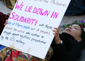 Gala King, FACES board chair, stated, “We lie here to demonstrate the victimization of women internationally and the disrespect for the Philippines propagated by current US foreign policy. We are in solidarity with Nicole, the victim of this atrocity, and the women of Philippine organizations working with her to seek justice for this crime.”