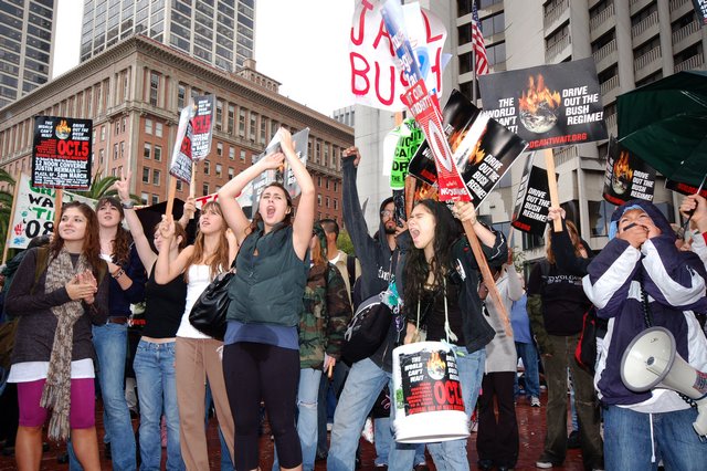 The unprecedented 24 hour demonstration in San Francisco organized by World Can't Wait – Drive Out the Bush Regime included two rallies, a march down Market Street, the jailing of a 40 foot statue of Bush, and an all-night vigil in Justin Herman Plaza.
