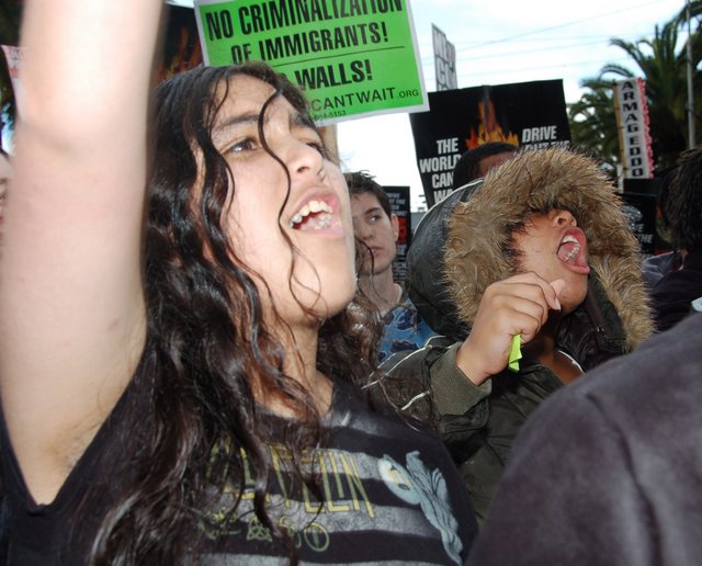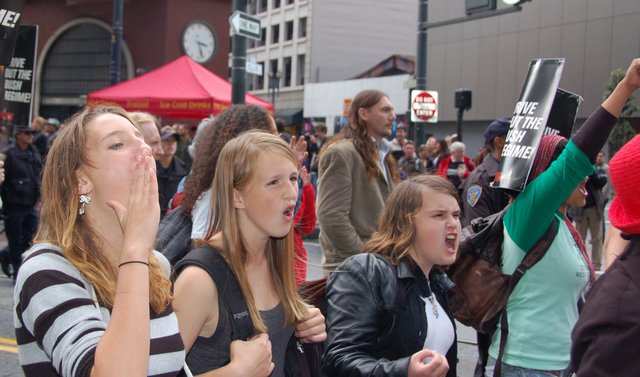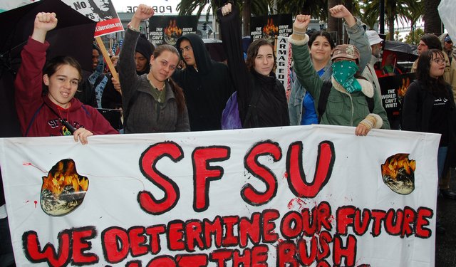 Yesterday thousands of people of all ages and backgrounds marched in the pouring rain through the streets of San Francisco as part of a nationwide day of protest. Students from all over the Bay Area walked out of school, many in the face of threats of suspension. Their message was clear: "The Bush Regime is setting out to radically remake society very quickly, in a fascist way, and for generations to come. We must act now; the future is in the balance."