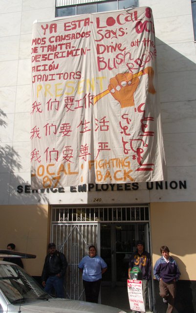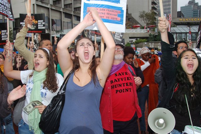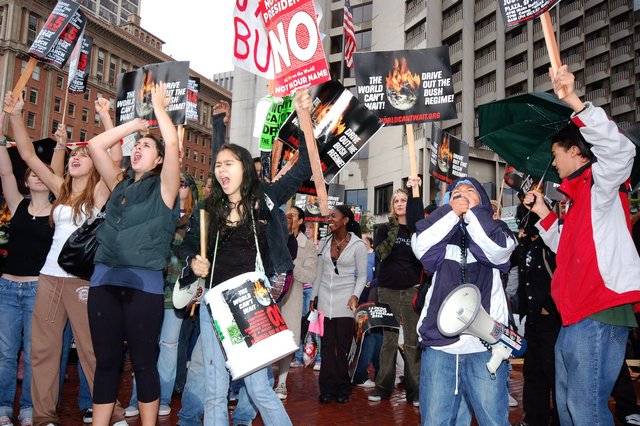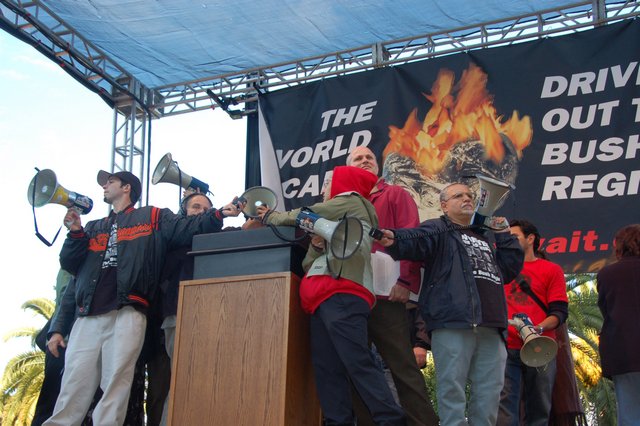 The protest went forward against attempts to suppress it. World Can't Wait and its supporters applied for all necessary permits and negotiated in good faith with the San Francisco Police Department and San Francisco city officials for permits to march and to rally. After first refusing a march permit, giving the reason of "homeland security" the SFPD backed down and granted the march permit. But at the main permitted rally yesterday as speakers, poets and rappers prepared to begin the program the city cut the power. As our call states, "If we speak the truth, they will try to silence us." And that is precisely what the City of San Francisco tried unsuccessfully to do yesterday. In spite of the actions of the City of San Francisco the rally went forward with improvised sound and was broadcast live on radio station KPFA.