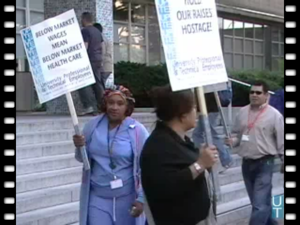 An informational picket at UCSF where healthcare workers demanded better pay in order to retain the best staff, who are leaving UCSF Medical Center for better pay and benefits. Video duration 1:31