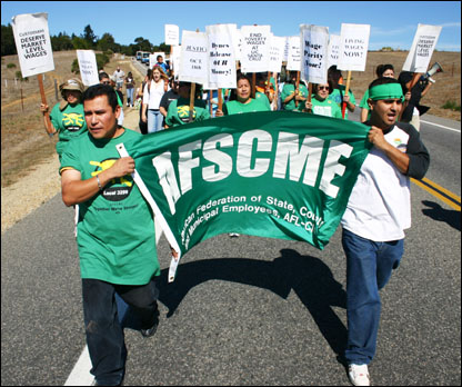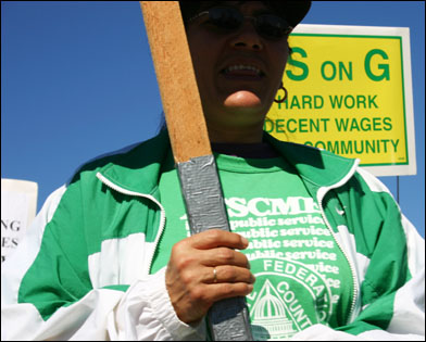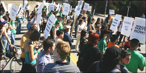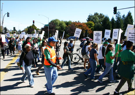 At noon on Wednesday, October 18, 2006, members of AFSCME 3299 and their supporters marched from the Bay Tree Plaza to the base of campus, where a roving picket line was held, followed by a rally. The workers have been engaged in a year-long struggle to receive wages similiar to those of neighboring colleges and universities where people can make up to 30% more for the same (or less) work. Over the summer, the California State Assembly passed legislation funding these wage increases, yet UC President Dynes has been holding the money hostage as a way of forcing union concessions over pension issues.