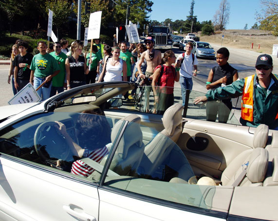 At the base of campus, people immediately marched into the center of the Bay and High intersection. Then everyone crossed the streets at the same time, though allowing cars to pass through without much delay. Since the police and Santa Cruz Metro began re-directing traffic away from the base of campus, people decided to use the opportunity to rally in the middle of the main entrance to campus. This was the first action this school year in ongoing struggle where students and workers are united in demanding social justice at UC Santa Cruz.