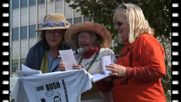 IMPEACH BUSH/CHENEY held an Impeachment Carnival of Horrors outside Congresswoman Nancy Pelosi's office in San Francisco on Oct. 31st and delivered petitions with 12,000+ names demanding that Pelosi take the lead in having the House of Representatives impeach George W. Bush. The Raging Grannies were there. Three-minute QT 7 movie. 30MB.