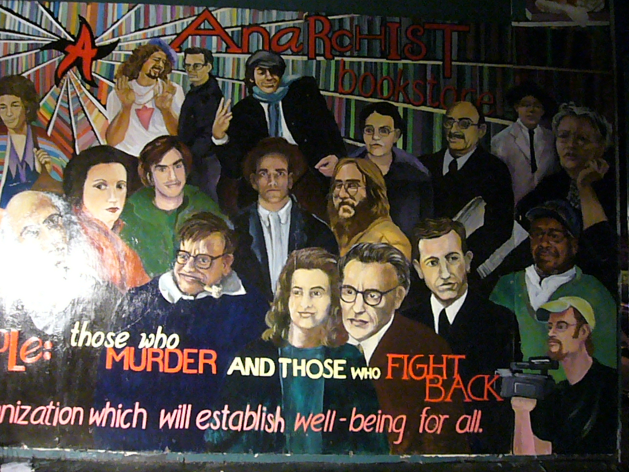 a new mural featuring Brad Will, Albert Parsons, Lucy Parsons, Voltairine de Cleyre, Tom Mooney, Kozmick Ladye, Rinaldo Iturrino, Tyron Kennan, Emmett Grogan, Emma Goldman, Alexander Berkman, Bartolomeo Vanzetti, Niccola Sacco, Enrique Flores Magon and Ricardo Flores Magon, Julian Beck, Judith Malina, Paul Goodman, Molly Steimer, Senya Fleshin, Marcus Graham, Tet, Jeff Yippie, Ishmael, Joe Hill, Dorothy Day, Elizabeth Gurley Flynn, Luisa Capetillo, Luis Kemnitzer, Lorenzo Kom'boa Ervin, and Martin Gonzales Sostre. Bound Together Books suppotting child porn as it used to be.