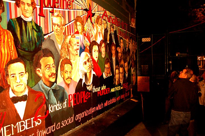 Others depicted in the mural include Lucy Parsons, Joe Hill, and local anarchists Tet and Jeff Yippie. The Mural was dedicated at small ceremony attended by a few dozen people yesterday and is open to the public. The area around the mural, previously open, has been fenced off in recent years as a part of attempts to make the Haight Street area less hospitable to homeless people. Bound Together is seeking the removal of the fence. The mural can be seen at 1369 Haight Street, on the side of the book store collective, which is open daily from noon to 7:30.