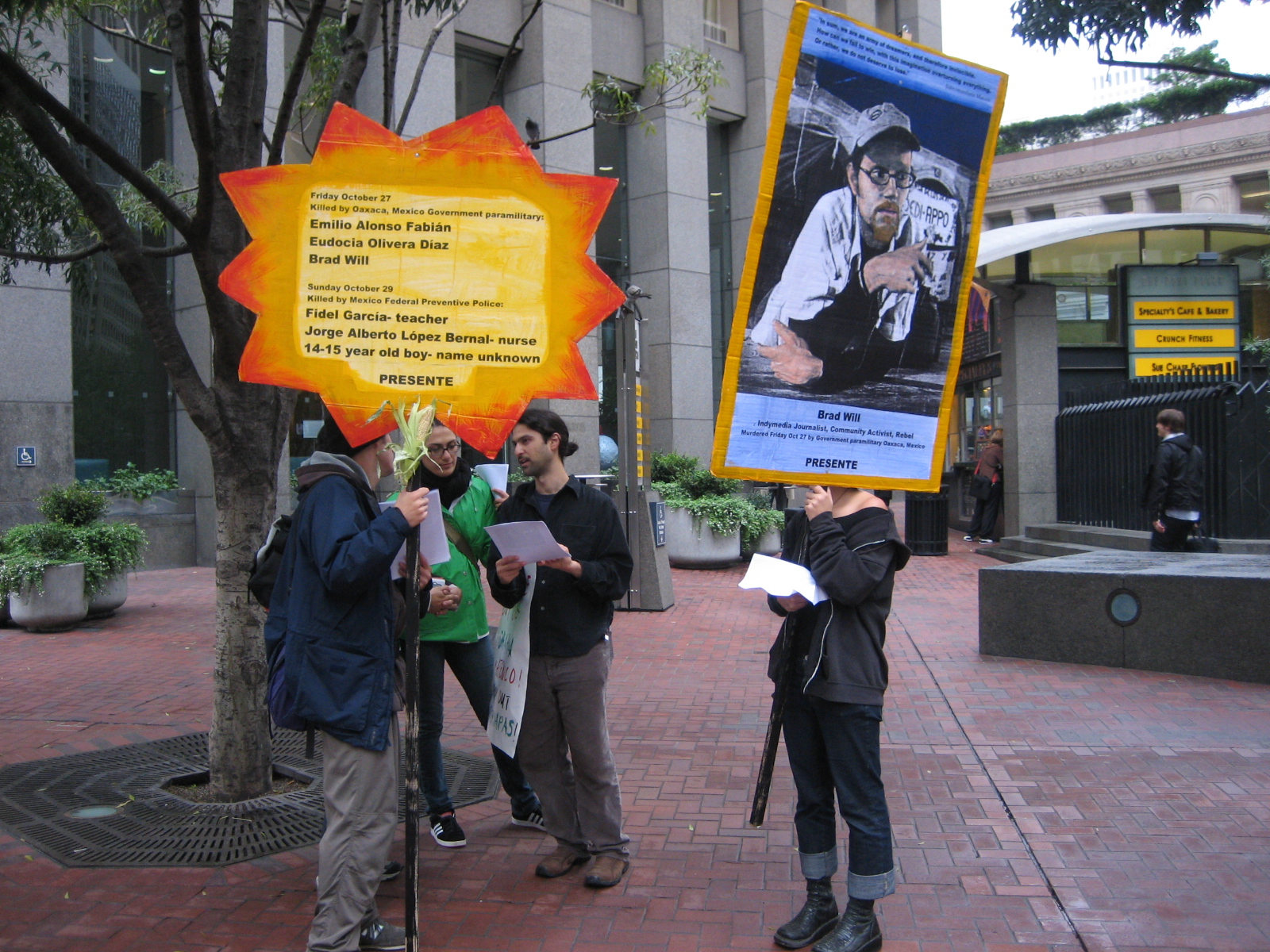 This friday morning, protesters gathered in front of the Mexican consulate in SF to bring attention to the situation in Oaxaca, and demand that U.S. authorities forward demands to the Mexican government. They also protested the use of Brad Will's death to justify the Mexican government's invasion of Oaxaca.