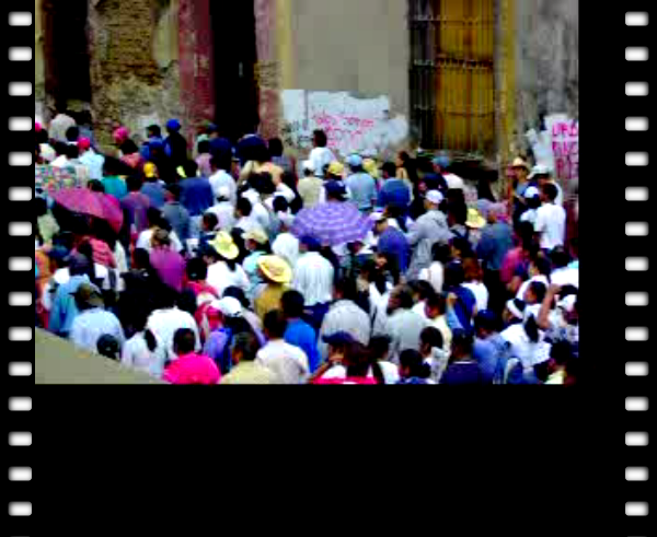 Other observations: I didn´t get the foto, but I did see a man who had left the march hand a video camera bag to a PFP agent, presumably after filming the march. A strange glider-shaped and almost silent airplane flew over the march relatively low--it has been circling the city since the ´govern´ment announced it was suspending fly-overs by helicopters. The march entered the city center, greeted by PFP lines reinforced by crisscrossed razor wire, penning the troops in behind a dumpster, a burned bus, and other obstacles. The huge march was directed away from the central Zòcalo by APPO organizers. In the interest of demonstrating overwhelming community support and non-violent resistance, marchers headed to the `new Zòcalo,´ Plaza Santo Domingo.