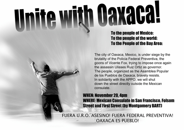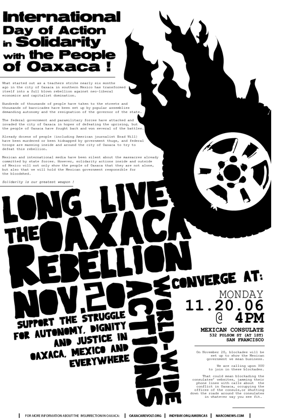 En noviembre 20, haremos saber al pueblo de Oaxaca que estamos escuchándolos, que nos preocupan y mas que nada, que los apoyamos. Enseñaremos nuestra completa solidaridad. Nos hemos prometido que no esperaremos, mientras los que luchan para cambiar el mundo son atacados por los capitalistas, burócratas y policías mercenarios.
