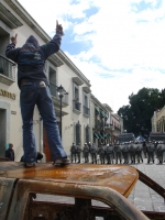 On Monday, the PFP clashed with APPO supporters. At several confrontations, tear gas was used, and many were injured. Barricades went up around Santa Domingo, which is where the APPO encampment is located. After 4:30pm, a truce was declared and protesters began negotiating for the release of 5 people who had been detained. Minute-by-Minute Report |