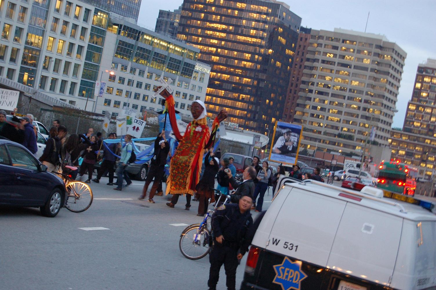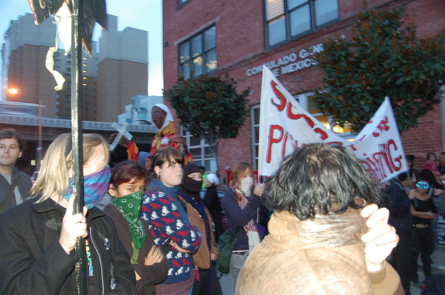 More photos from today's (Monday Nov 20) protest at the Mexican Consulate in San Francisco. Marches and blockades around the world today brought sought to show solidarity for a popular uprising in Mexico, where street barricades and blockades of all sorts has evolved into a delicate autonomy for strikers seeking the removal of the hugely corrupt Mayor Ruiz and his government.