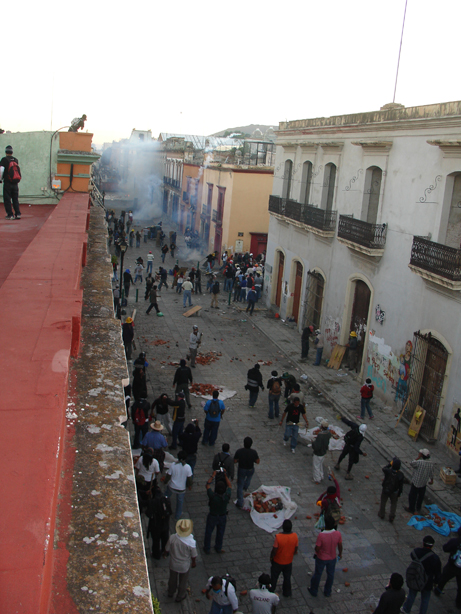 "it gives the police an excuse to respond with violence" - the police don't need an excuse to respond with violence - or initiate violence - or escalate violence - that is their purpose. they will behave like the violent thugs they are whether protesters "give them an excuse" or not - as anyone who is i) black ii)poor iii)etc well knows. at least the people of Oaxaca at least are challenging the "lets all stand in a line and watch our heads get kicked in" paradigm.