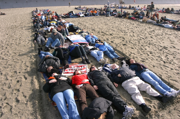 Flash Mob Forms Giant Impeach Sign on San Francisco Beach. (Note: Not having a helicopter I had to make the first photo a composite.)